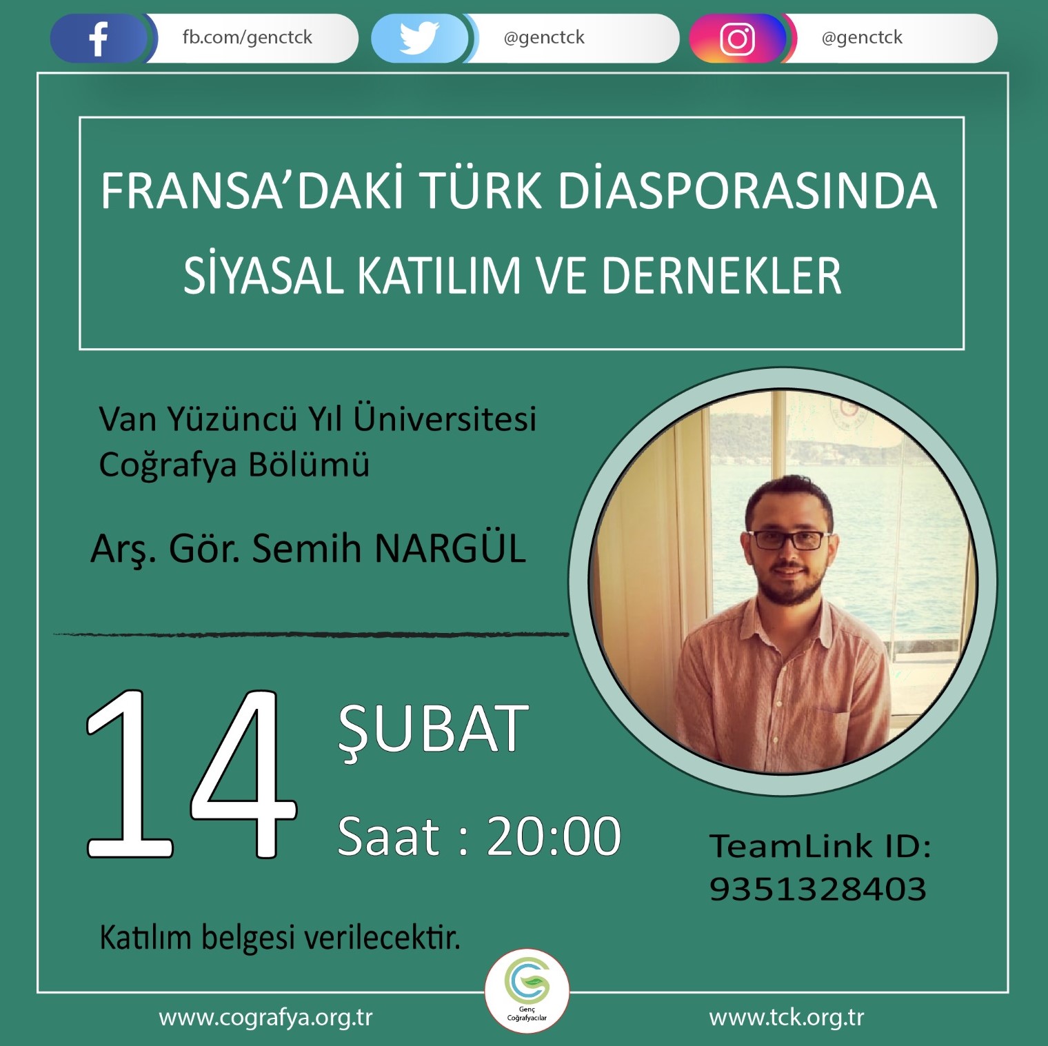İlk konuğumuz Van Yüzüncü Yıl Üniversitesi Coğrafya Bölümü’nden Arş. Gör. Semih Nargül, “Fransa’daki Türk Diasporasında Siyasal Katılım ve Dernekler” konulu bir sunum gerçekleştirecektir.