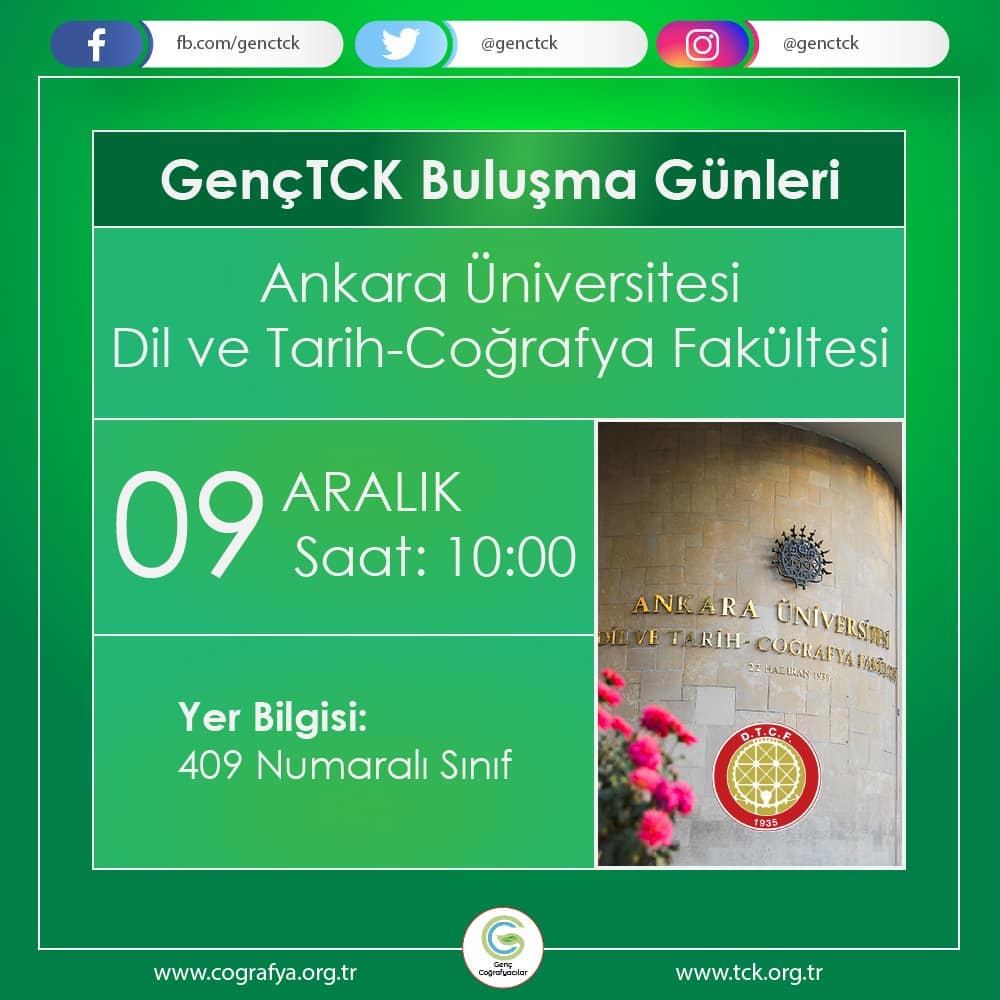 Üniversitesi’nde düzenliyoruz! Coğrafya bölümü öğrencilerimize GençTCK’yı tanıtmak, üyeliğe teşvik etmek ve Ankara Üniversitesi’nde faaliyetlerimizi geliştirmek için bir tanıtım toplantısı düzenliyoruz. Buluşma günümüz 9 Aralık 2021 tarihinde, saat 10:00’da 409 numaralı sınıfta düzenlenecektir. Katılımlarınızı bekliyoruz!