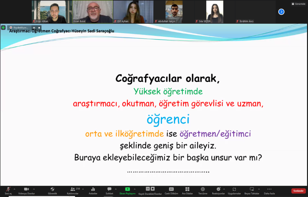 Etkinliğimizin konuşmacısı Türk Coğrafya Kurumu Başkan Yardımcısı Prof. Dr. İhsan Bulut hocamız ilgili sunumuna geçmişten günümüze coğrafya ve coğrafya öğretmenliği eğitiminin gelişimini ve değişimini aktararak başlamış, alanımızdaki sorun ve problemlere değinmiş, başta Hüseyin Sadi Saraçoğlu olmak üzere önemli coğrafya eğitmenlerini ve coğrafyaya kazandırdıkları eserlerini anlatmıştır. Etkinliğimiz soru-cevap kısmı ile sona ermiştir.
