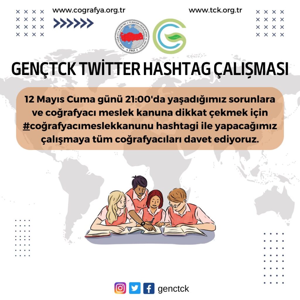 Türk Coğrafya Kurumu Gençlik Birimi olarak 12 Mayıs Cuma günü 21:00’da yaşadığımız sorunlara dikkat çekmek için #coğrafyacımeslekkanunu hashtagi ile yapacağımız Twitter Çalışmasına tüm coğrafyacıları davet ediyoruz.